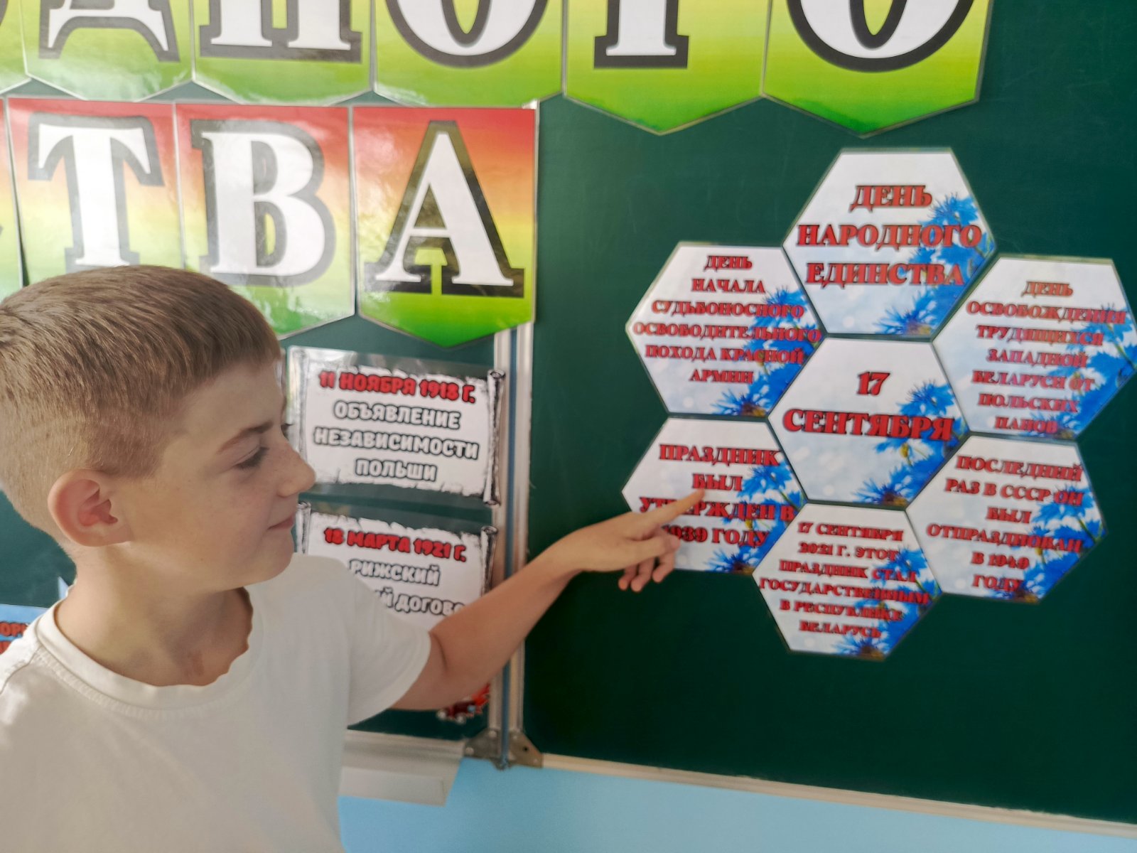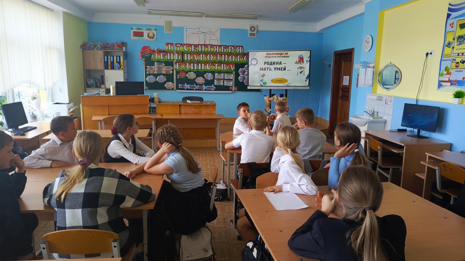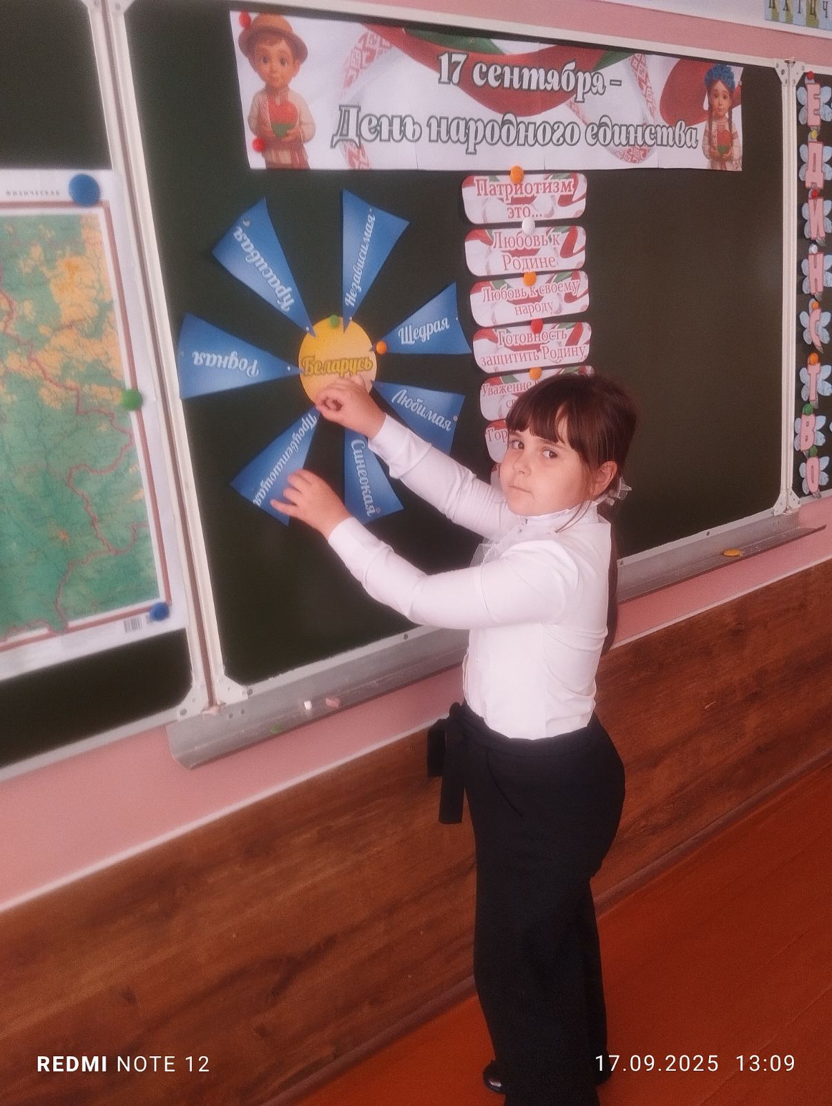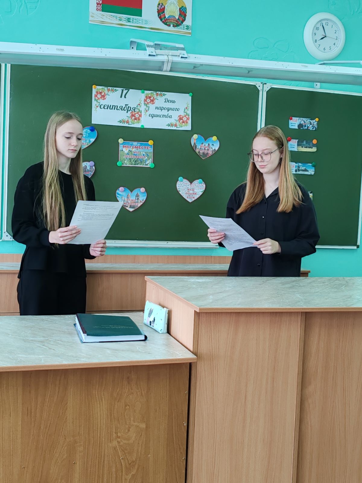 17 сентября 2025 г. прошел урок, посвященный Дню народного единства. Урок направлен на формирование у учащихся уважительного отношения к историческому прошлому Беларуси, понимания учащимися смысла и значения государственного праздника – Дня народного единства, важности единства белорусского народа для сохранения сильного и независимого государства; воспитание гражданственности, патриотизма, ответственности и готовности действовать во благо своей Родины.