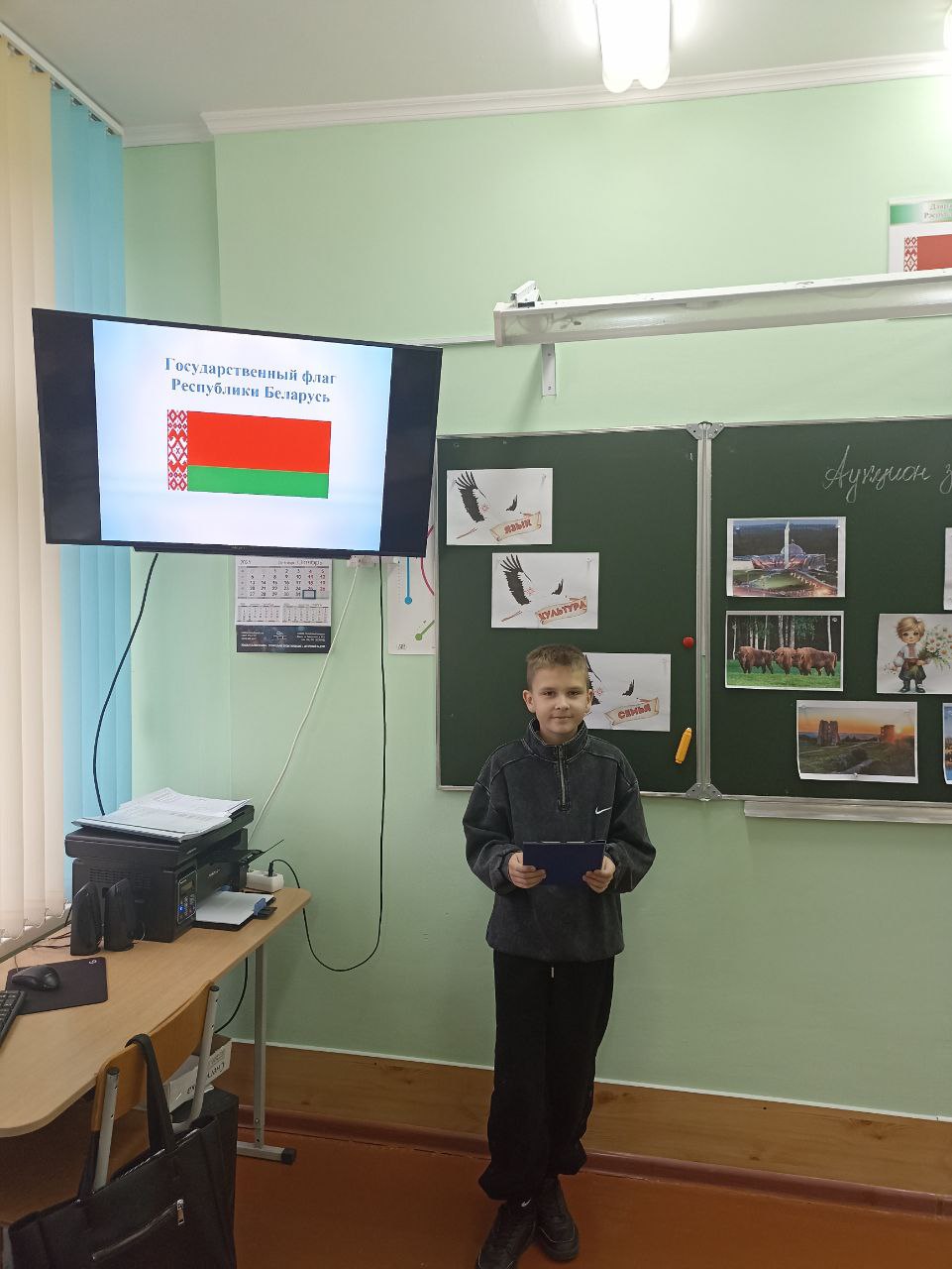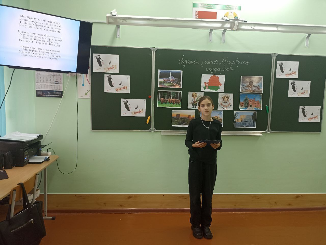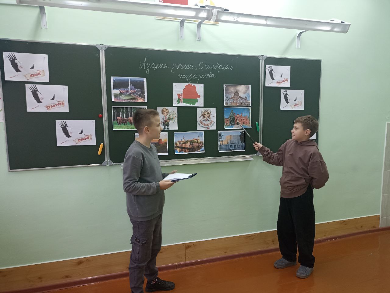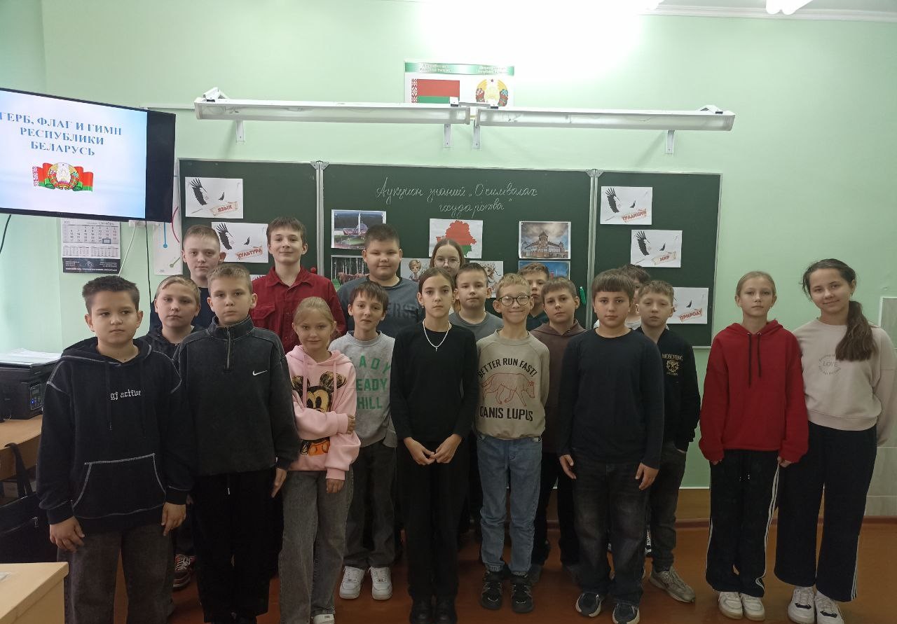 Ребята рассказали о значении каждого из символов Республики Беларусь. Вспомнили, как они возникли, для чего нужна государственная символика, что обозначает каждая составляющая часть герба, какой смысл несут в себе три цвета белорусского флага, в каких случаях звучит гимн и как правильно вести себя при его звучании и исполнении. С учащимися проведена тематическая викторина на знание государственных символов и различных объектах, которые являются визитной карточкой Беларуси.