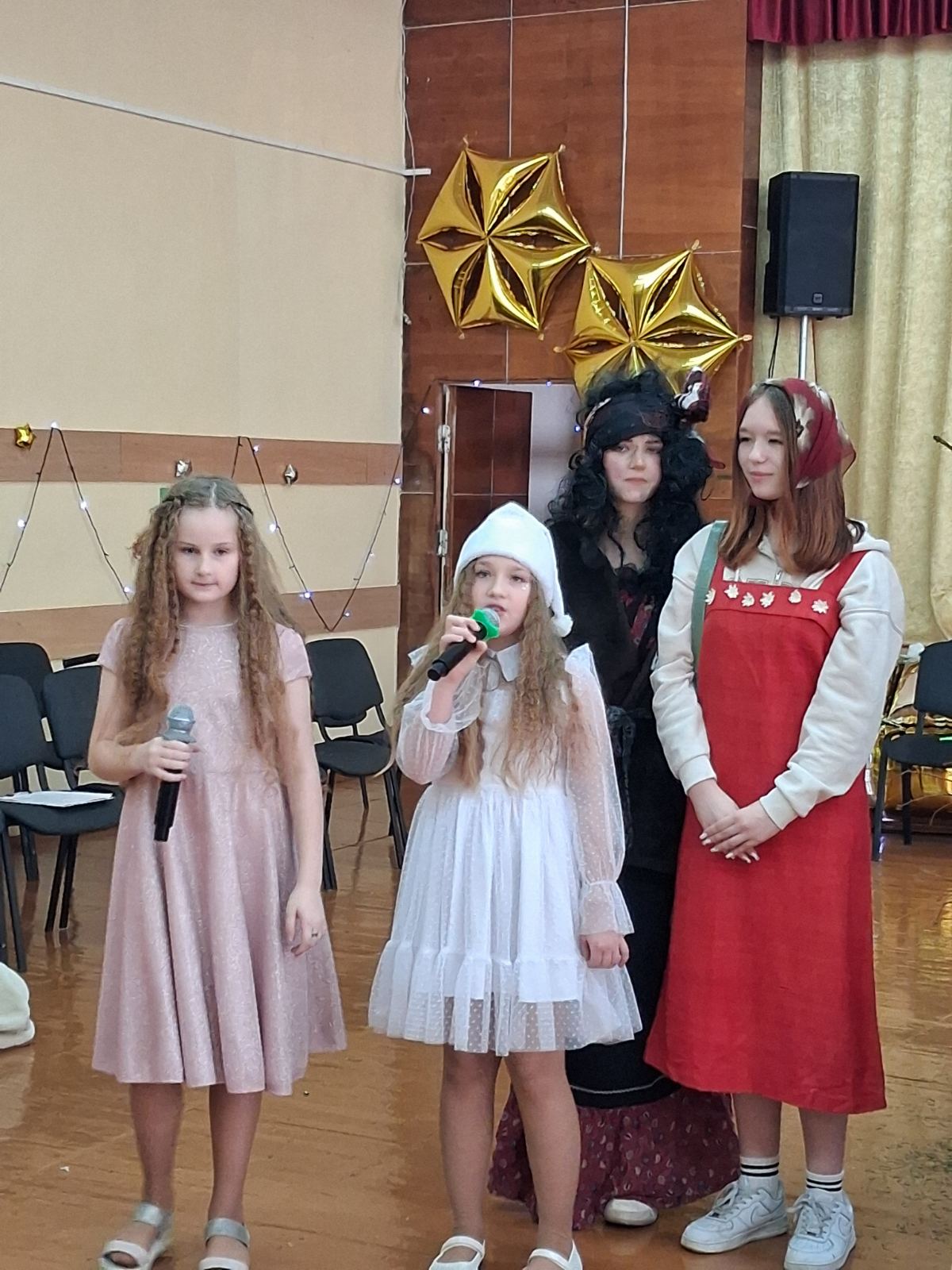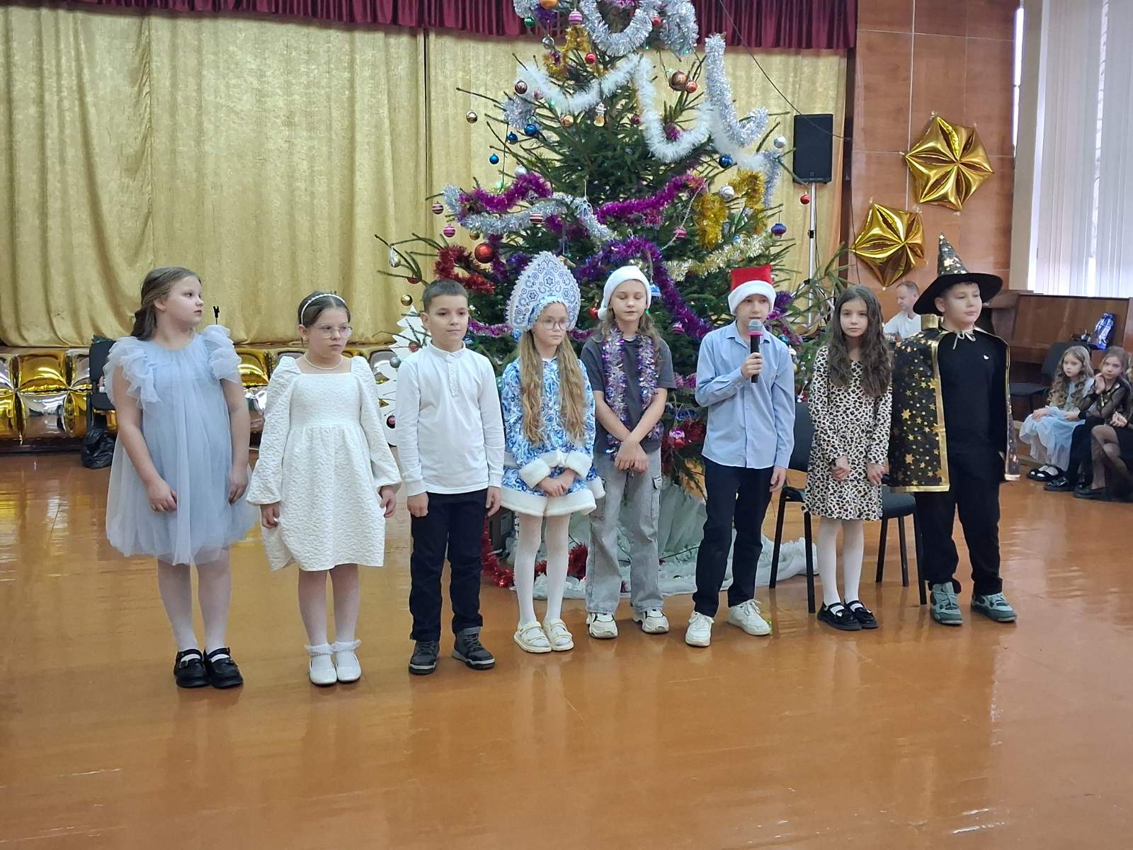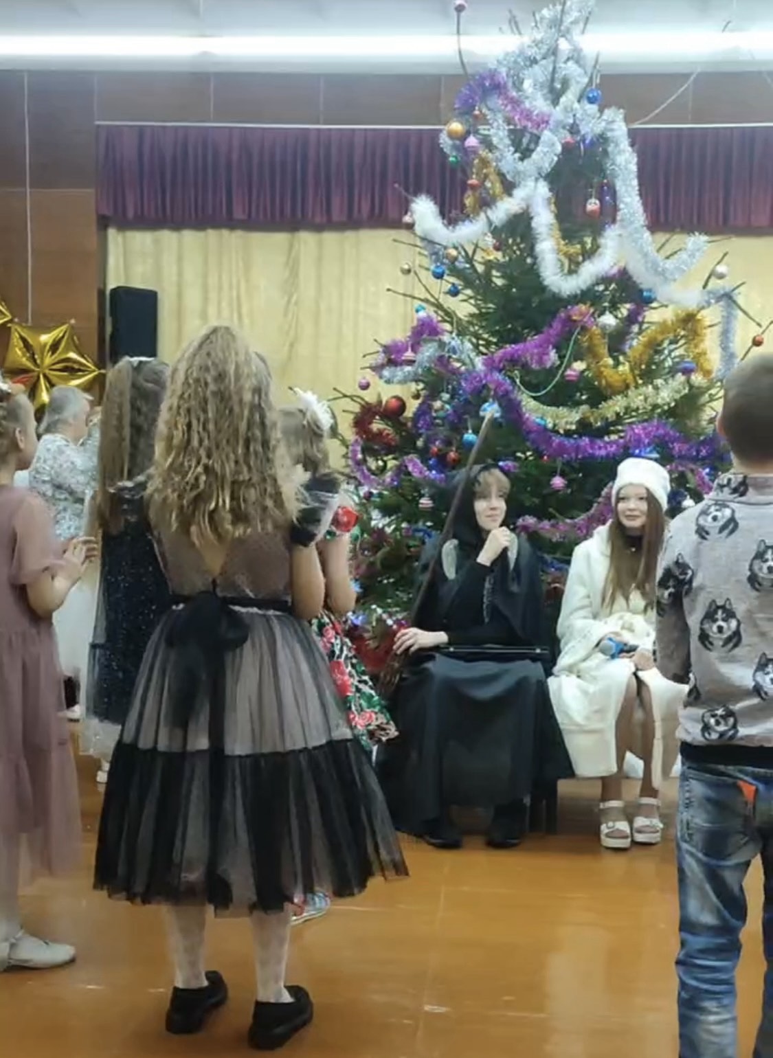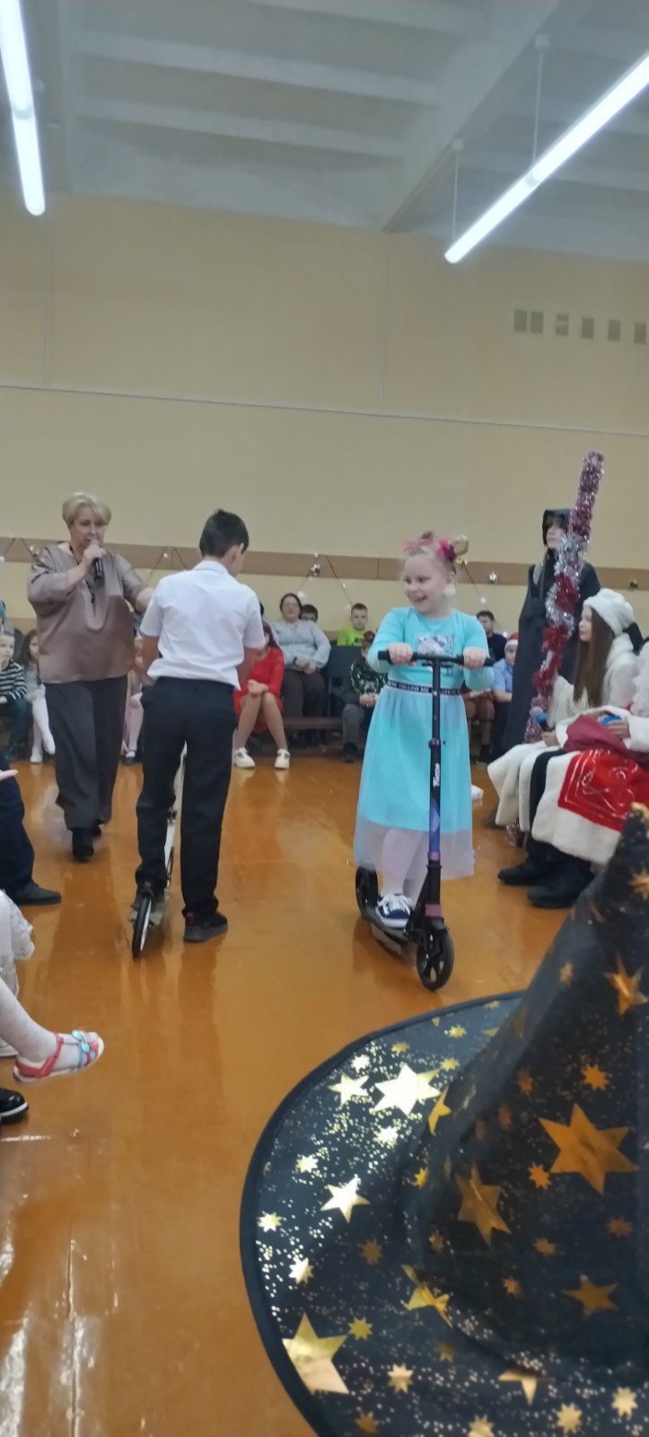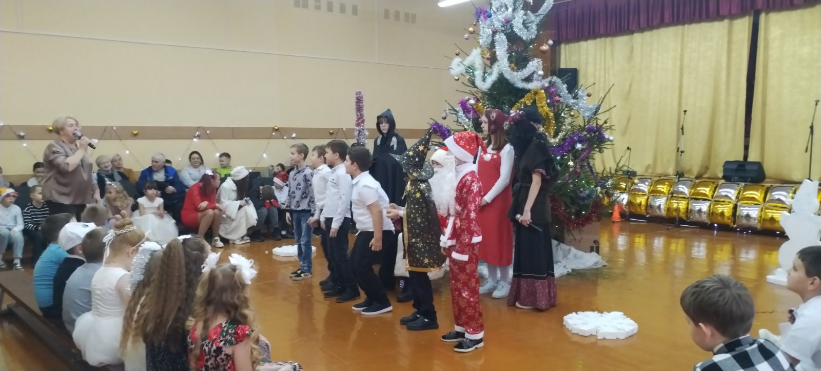 Программа продолжилась традиционными хороводами и флешмобом у ёлки, чтением стихов, исполнением песен и весёлой сценкой «Новогодние традиции». Праздник получился динамичным, остроумным и очень современным.