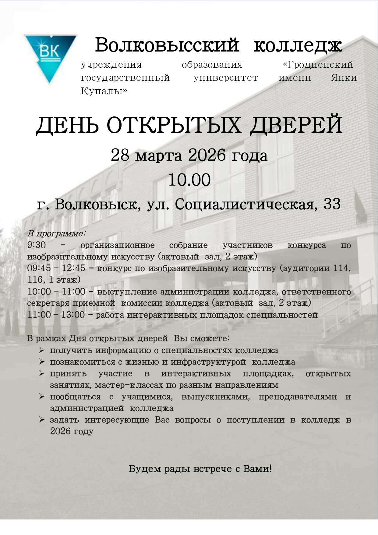 Волковысский колледж приглашает! Предыдущий: Новогрудский государственный колледж технологий и безопасности приглашает Назад Следующий: Колледж бытового обслуживания населения приглашает Вперед