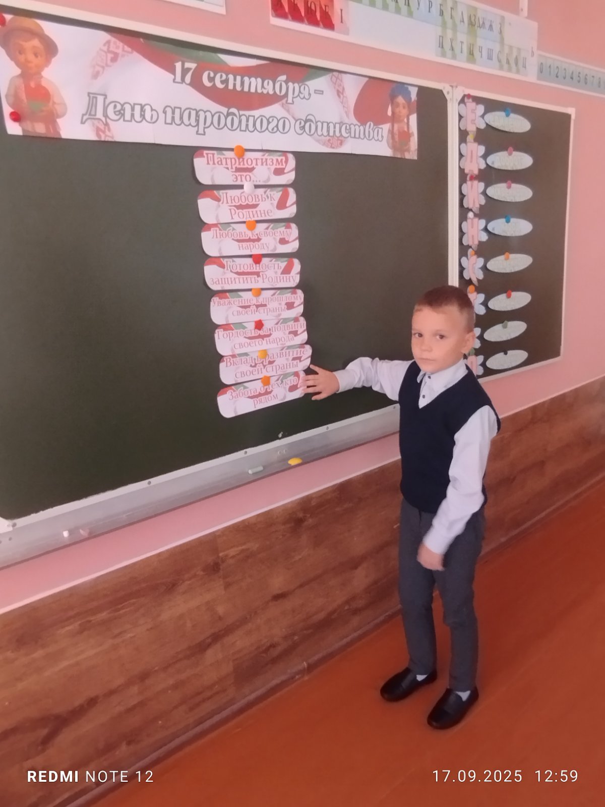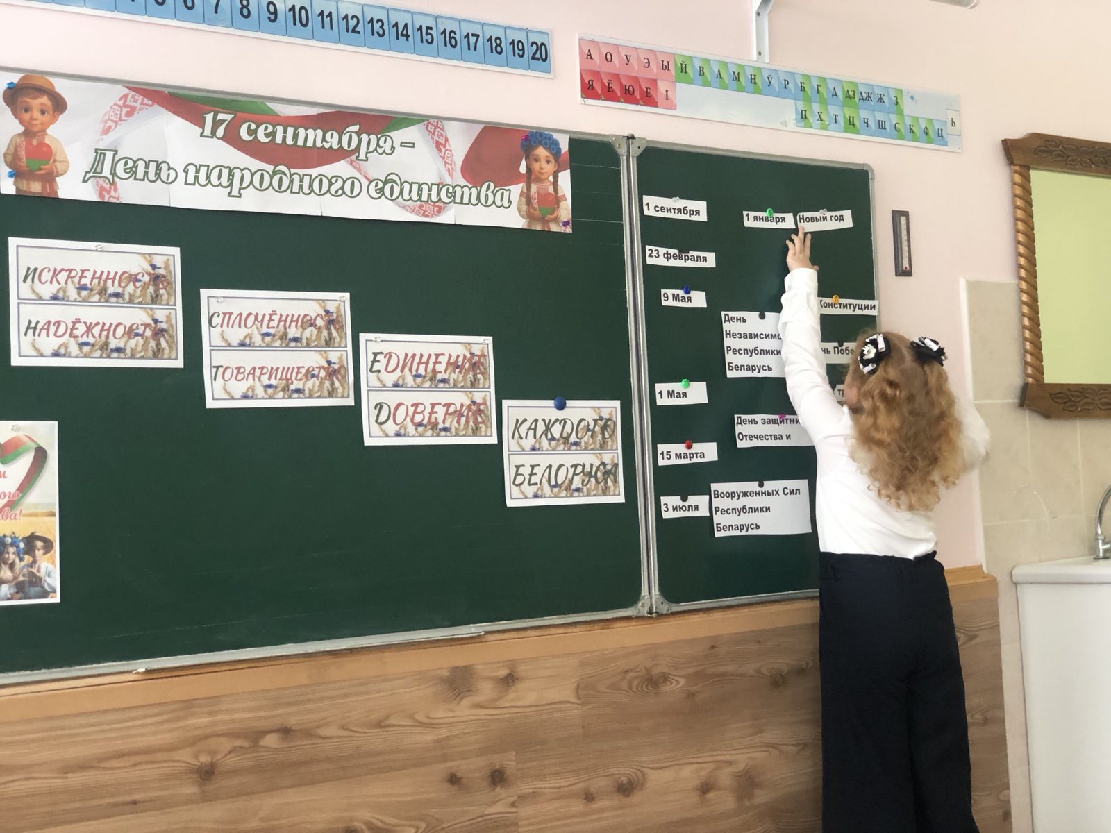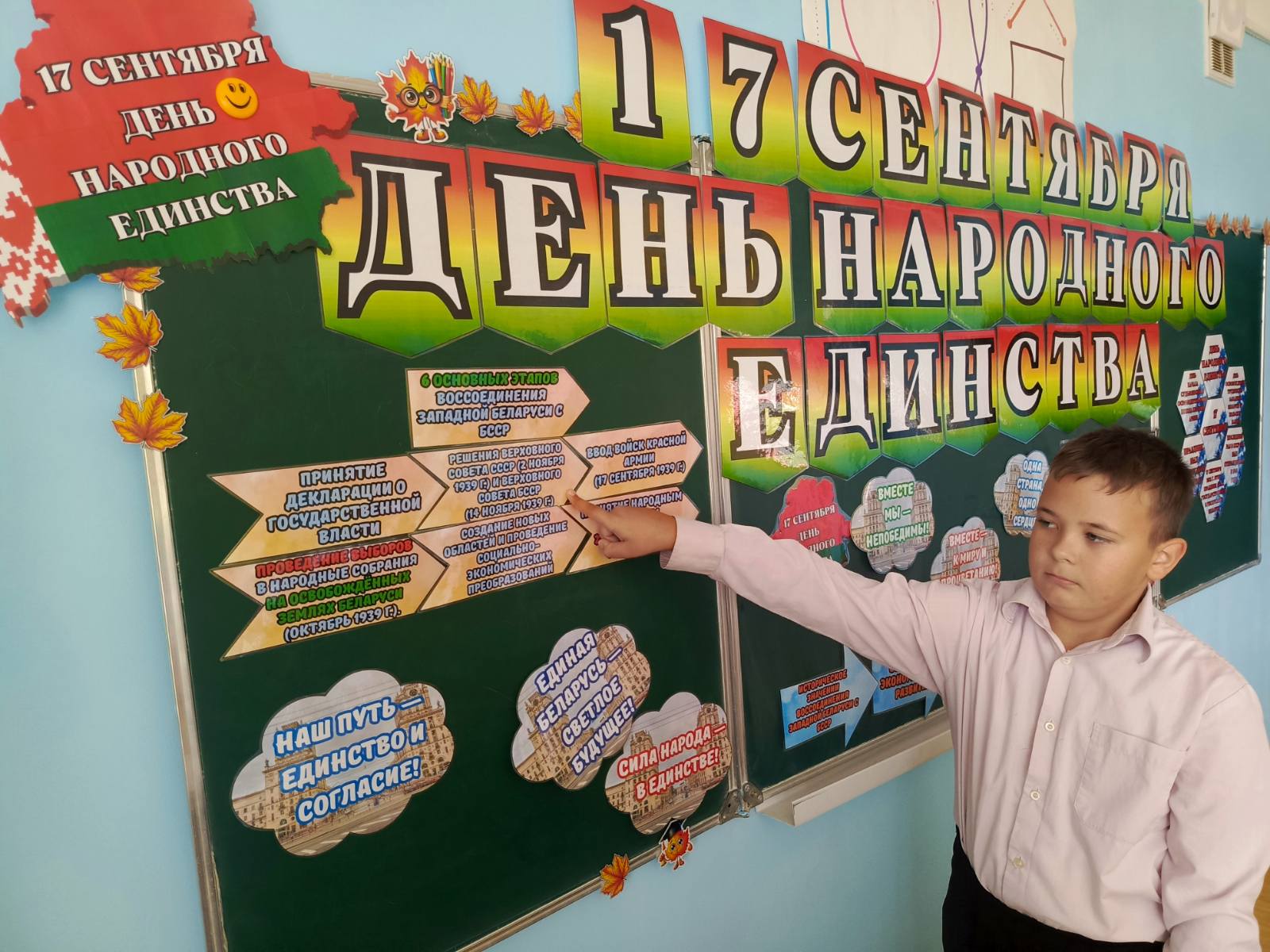 17 сентября 2025 г. прошел урок, посвященный Дню народного единства. Урок направлен на формирование у учащихся уважительного отношения к историческому прошлому Беларуси, понимания учащимися смысла и значения государственного праздника – Дня народного единства, важности единства белорусского народа для сохранения сильного и независимого государства; воспитание гражданственности, патриотизма, ответственности и готовности действовать во благо своей Родины.