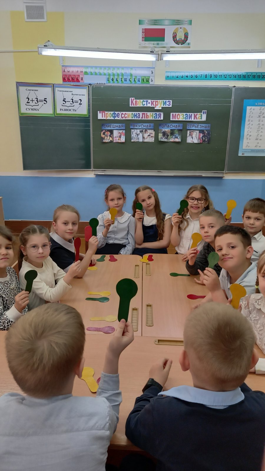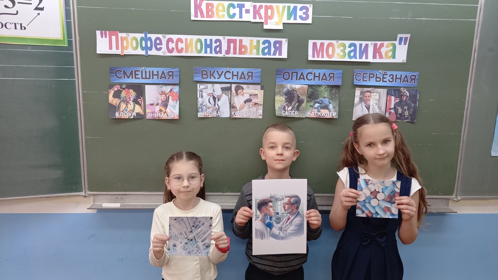 В шестой школьный день в первых классах прошёл квест-круиз "Профессиональная мозаика". Ребята соревновались в отгадывании загадок о профессиях. Найбольший интерес учащиеся проявили в задании "Бюро находок', где определяли, какой профессии принадлежат те или иные вещи. Каждый выбрал себе будущую профессию и рассказал, чем она его привлекает.